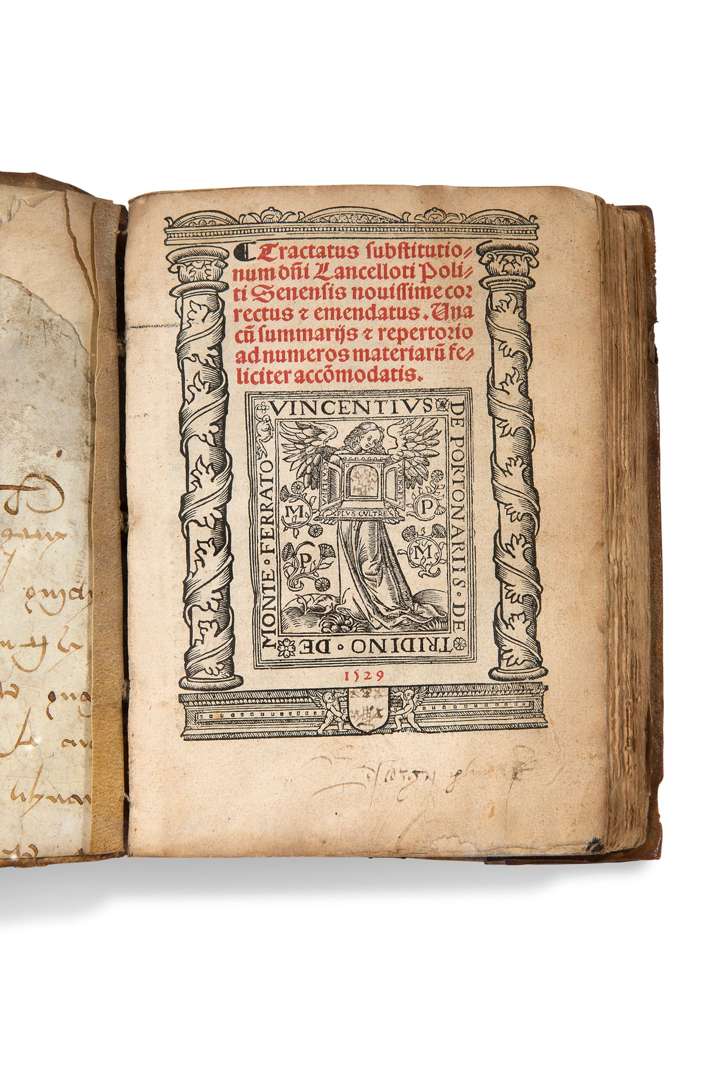 Tractatus substitutionum d[omi]ni Lancelloti Politi Senensis nouissime correctus et emendatus, una cu[m] summariis et repertorio ad numeros materiaru[m] feliciter acco[m]modatis [Lyon], Vincent de Portonariis, 1529. In-12 (188 x 140 mm), a-giii-[g vi]-n[viii]. Plein vélin souple, coutures visibles, dos lisse titré et daté à l'encre brune (reliure d'époque).