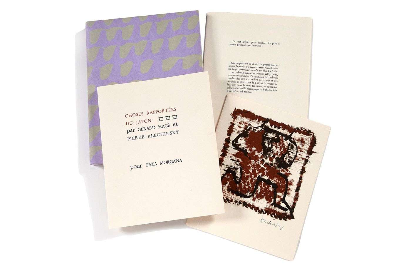 In-8 carré, en feuilles sous couverture imprimée rempliée de l'éditeur, emboîtage de l'éditeur recouvert d'une lithographie en mauve et gris clair.