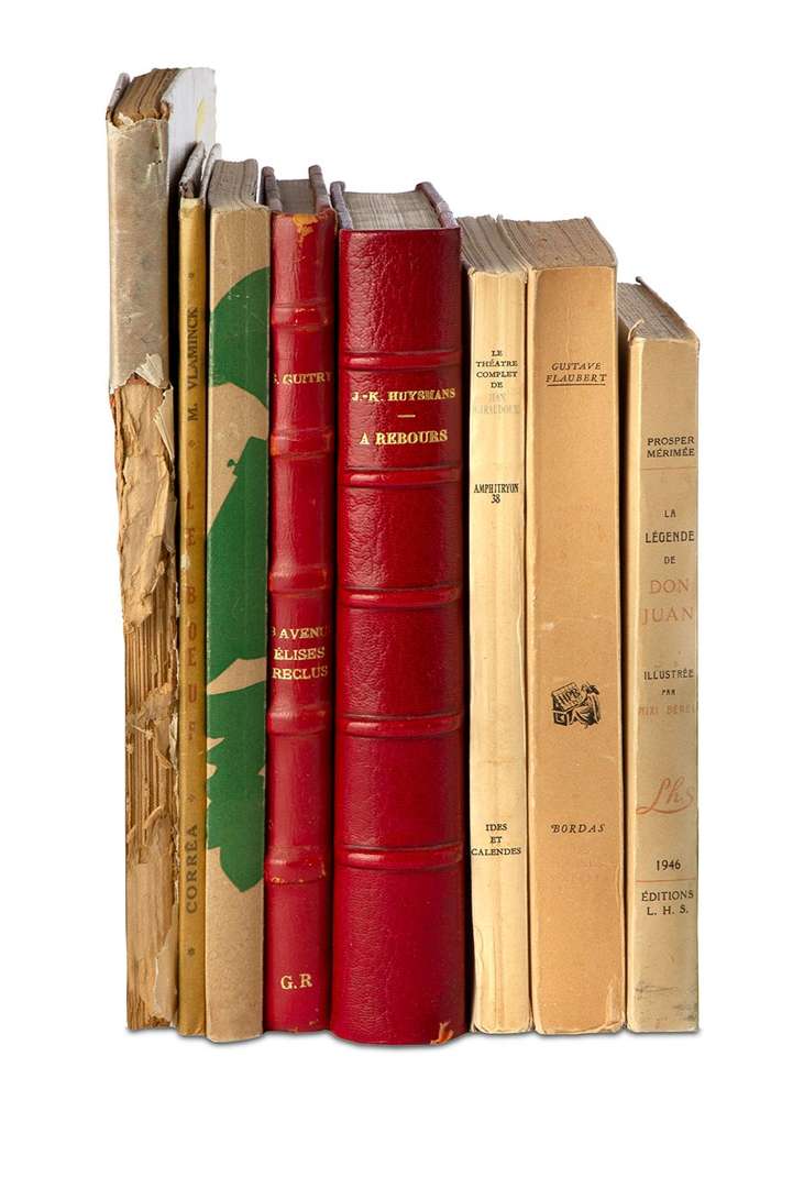 - DUDAN (Pierre). La peur gigantesque de Monsieur Médiocre. Illustrations de Dubout. 1947. In-8 broché | - FLAUBERT (Gustave). Madame Bovary. Préface de La Varende. Edition illustrée et annotée. 1948. In-8 broché | - GIRAUDOUX (Jean). Amphitryon 38. Frontispice de Christian Bérard. 1945. In-8 broché | - GUITRY (Sacha). 18 avenue Elisée Reclus. 1952. Grand in-8, demi-basane rouge à bande. E. O. | - GUITRY (Sacha). La maladie. [1914]. In-4 broché (couverture délabrée). E. O. | - HUYSMANS (Karl-Jöris). A Rebours. Illustrations de Auguste Leroux. 1920. Grand in-8, demi-maroquin rouge à coins | - MÉRIMÉE (Prosper). La légende de Don Juan. Illustrations de Max Bérel. 1946. In-12 broché | - VLAMINCK (Maurice). Le bœuf. 1944. In-8 broché.