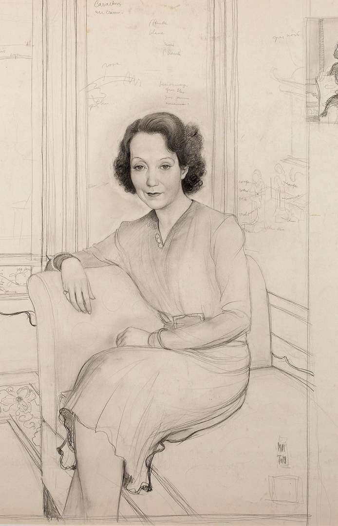 Mme M. C. devant un paravent, encre et couleurs sur soie. Collection privée (fig.8 page 35 du catalogue de l’exposition en 2021 Mai Thu, écho d’un Vietnam rêvé, au Musée des Ursulines de Mâcon, en partenariat avec le Musée Cernuschi)