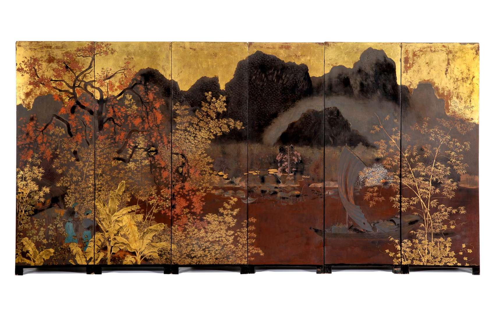Laque à réhauts d'or, paravent en six panneaux, signé et daté en bas à droite