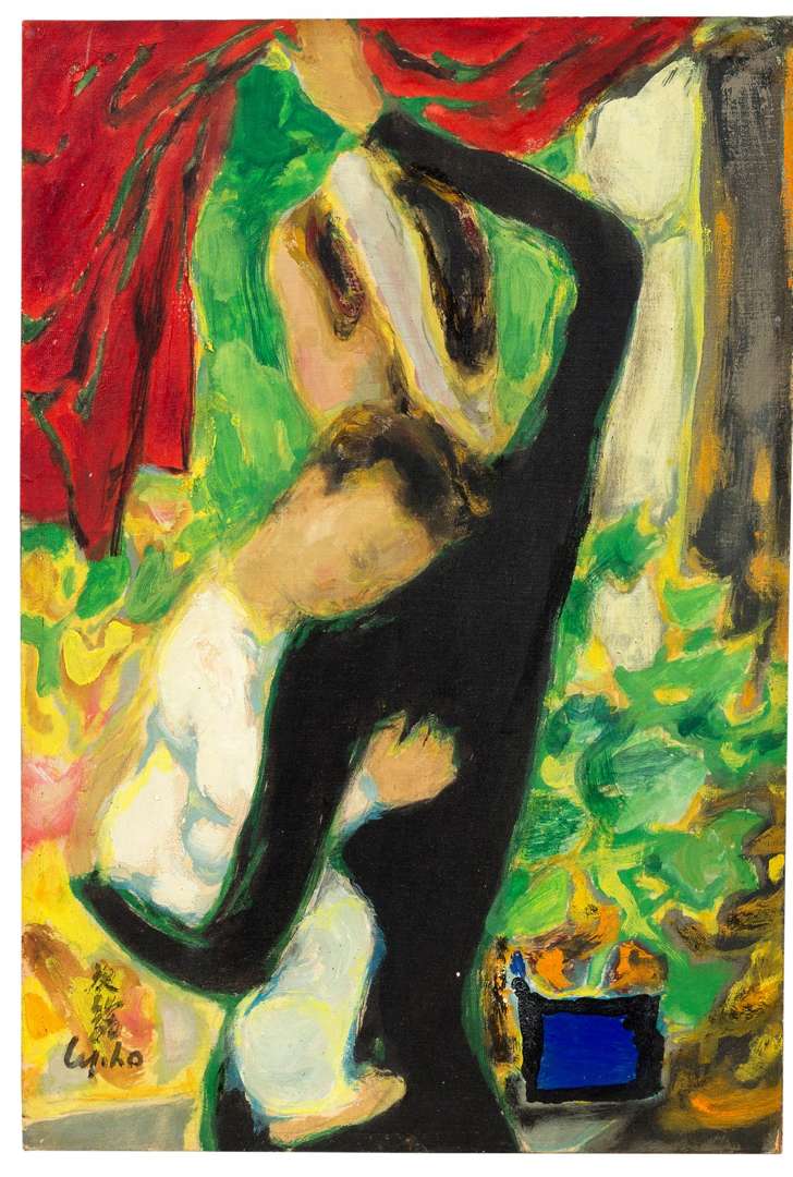 Restant fidèle à ses origines, l’artiste illustre une mère enlaçant son enfant, coiffée du turban blanc, élément typique de la tenue traditionnelle vietnamienne. Ainsi, malgré une technique moderne inspirée des courants artistiques européens, Lê Phổ reste attaché à la représentation de sa culture d’origine. Le traitement de la scène est révélateur d’un apport impressionniste et nabi. Cette scène d’étreinte maternelle s’inscrit dans le renouveau stylistique de Lê Phổ à partir de son arrivée en France. Elle est caractérisée par une modernisation de son style, avec une vivacité et une clarté accrues des couleurs, dont la finesse de l’encre vient à quelques endroits apporter davantage de précision. Ces apports témoignent directement de l’influence décisive de Pierre Bonnard sur l’œuvre du peintre vietnamien. Représentés de dos, les personnages liés par la tendresse reliant la mère et l’enfant excluent le spectateur de la scène. Ils sont tournés vers ce rideau rouge saillant qui met en exergue l’importance de celui ou celle qui est attendu.