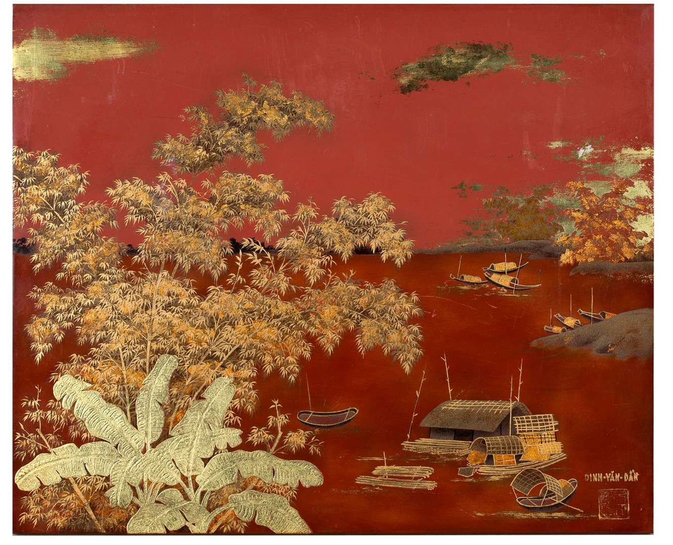 Laque à fond rouge et rehauts d'or, signée en bas à droite