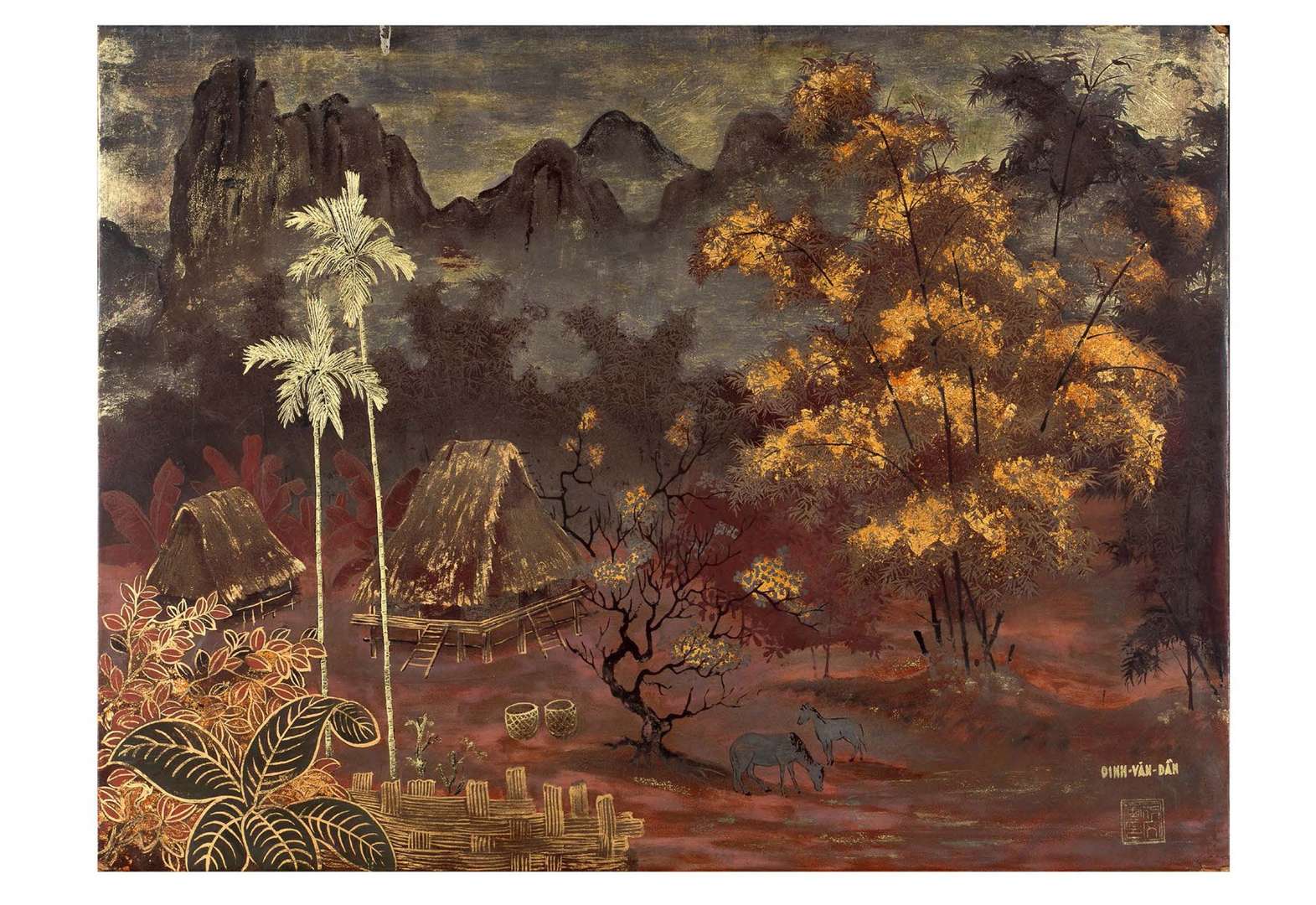 Laque à fond rouge et rehauts d'or, signée en bas à droite