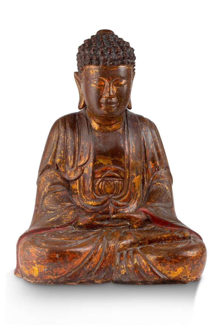 Statuette de bouddha en bois laqué et anciennement doré de belle patine, représenté assis en vajrasana, les mains en dhyanamudra, vêtu d'une robe ceinturée à la taille, les yeux clos en méditation et les cheveux bouclés.