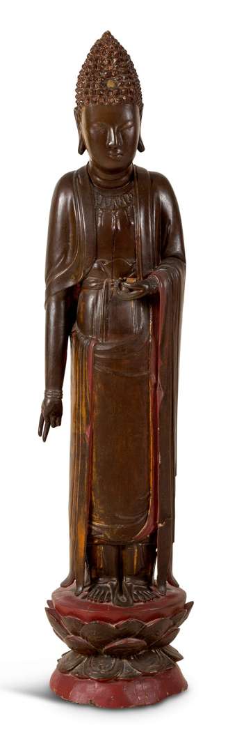 Grande statuette de bouddha en bois laqué et anciennement doré de belle patine, représenté debout sur un socle lotiforme,la main gauche tenant le fruit du myrobolan, le bras droit tombant le long du corps, vêtu d'une robe ceinturée à la taille, un collierà pendoloques autour du cou, les yeux clos en méditation et les cheveux et l'ushnisha bouclés.