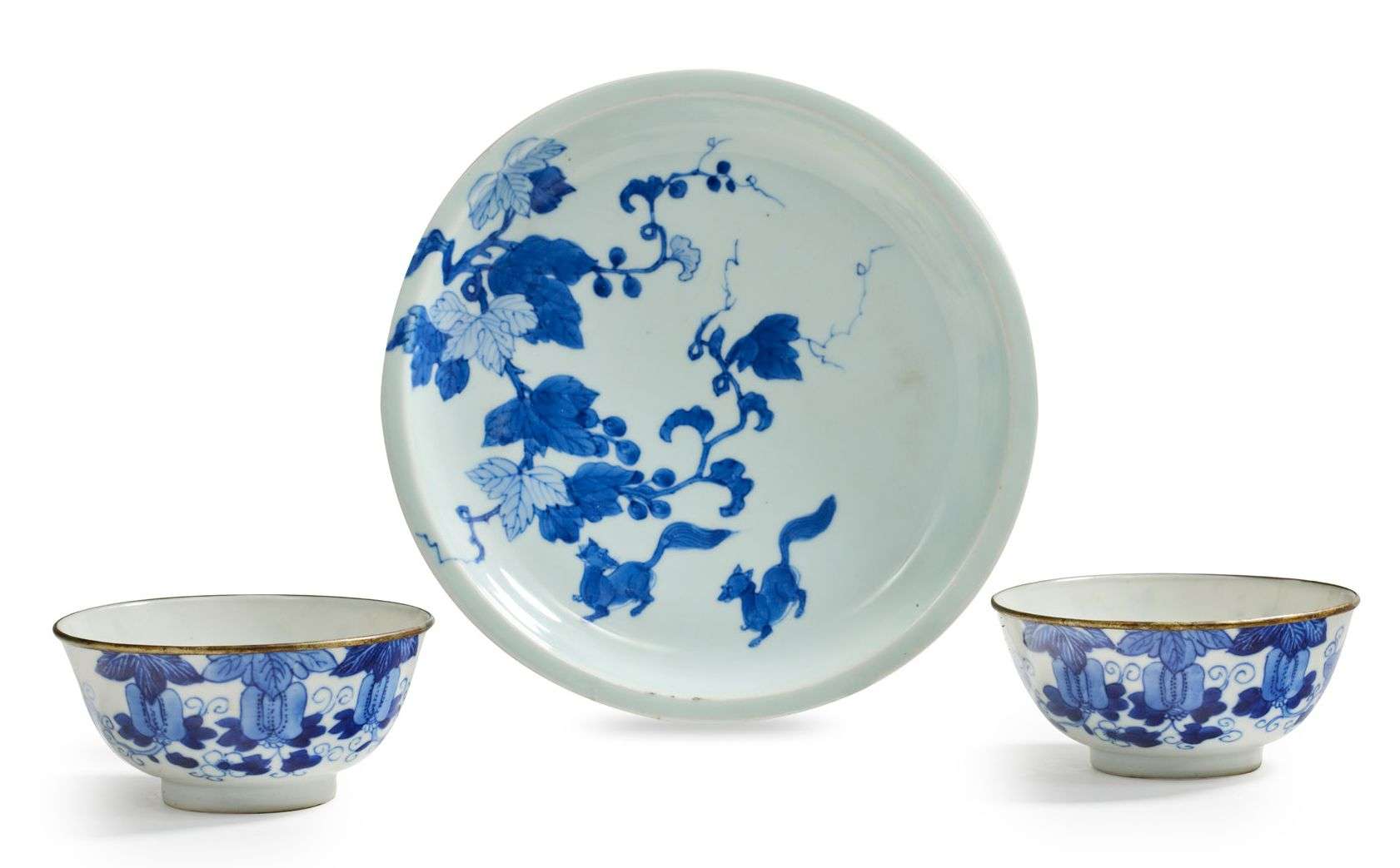 Lot de trois objets en porcelaine bleu-blanc comprenant deux bols à décor de coloquintes et papillons et une coupe circulaire à décor d'un couple de toupayes sous les pampres, le bord des bols cerclé de métal.