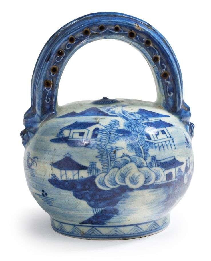 Pot-à-chaux sphérique en porcelaine bleu-blanc, à décor d'un paysage de bord de mer construit de pavillons et animé de personnages, l'anse terminée par des têtes de chimères, la panse irrégulièrement creusée d'un large orifice.