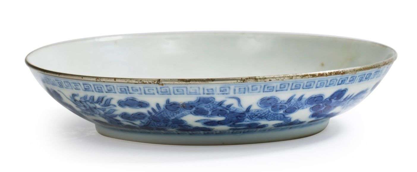 Intéressante coupe circulaire en porcelaine bleu-blanc, à décor de deux dragons pourchassant la perle enflammée dans les nuées et les éclairs dans un encadrement de leiwens, le bord cerclé de métal.