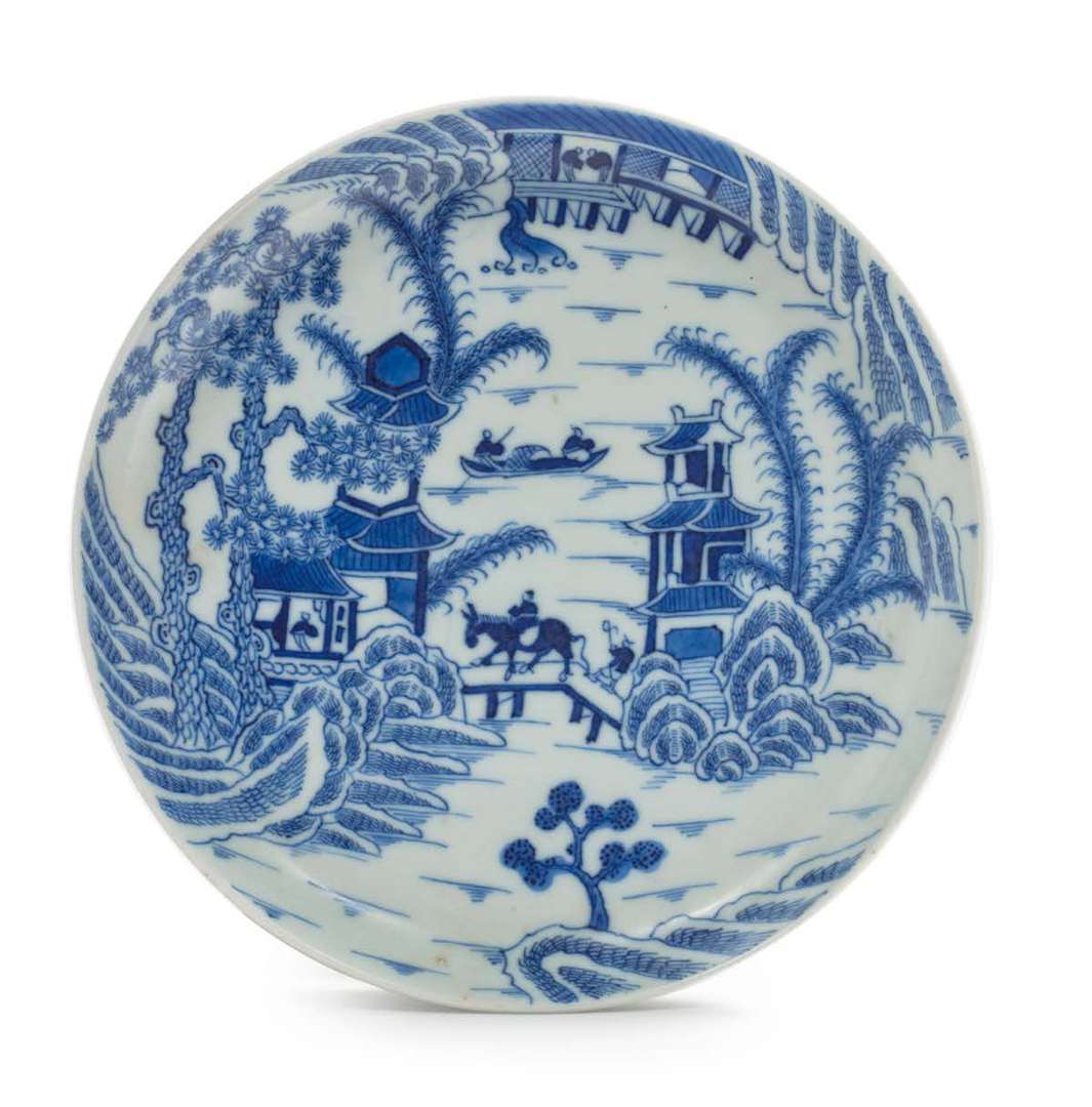 Coupe circulaire en porcelaine bleu-blanc, à décor continu d'un paysage lacustre construit de pavillons et animé de personnages.