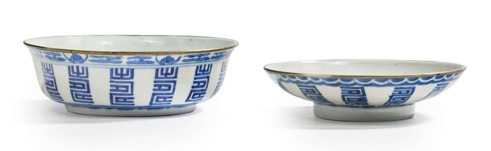Bol couvert en porcelaine bleu-blanc, à décor de caractères auspicieux, la base surmontée de flots stylisés et le bord souligné d'une frise de chauves-souris dans les nuées, le bord cerclé de métal.