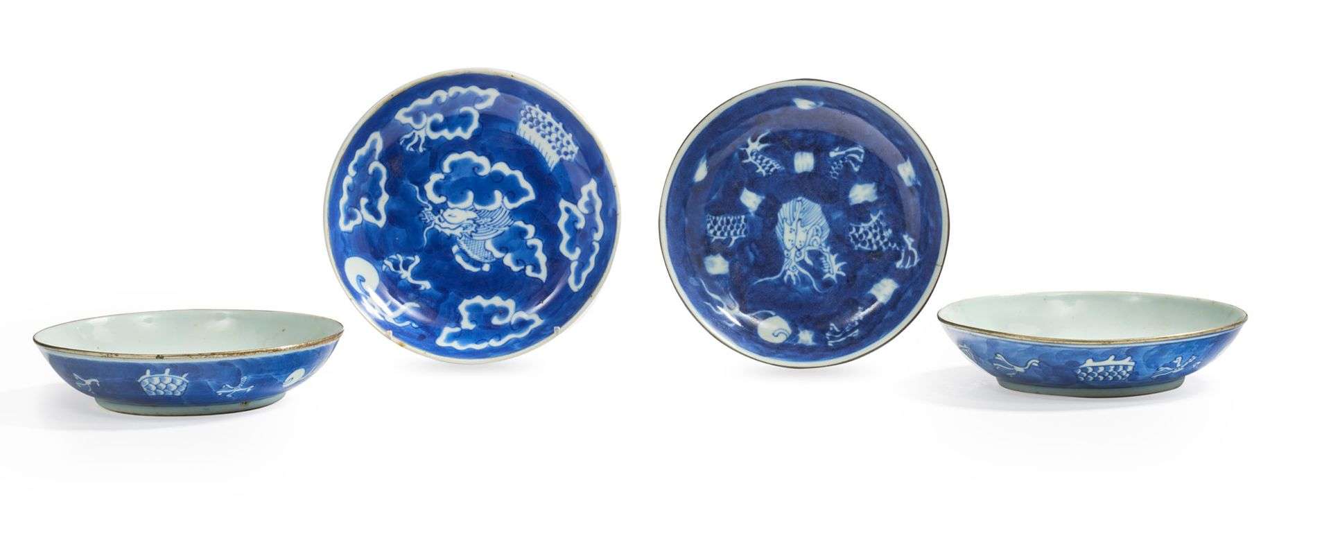 Lot de quatre coupes circulaires en porcelaine bleu-blanc, à décor sur le bassin ou sur la paroi extérieure de dragons pourchassant la perle enflammée dans les nuées, le bord de trois des coupes cerclé de métal.