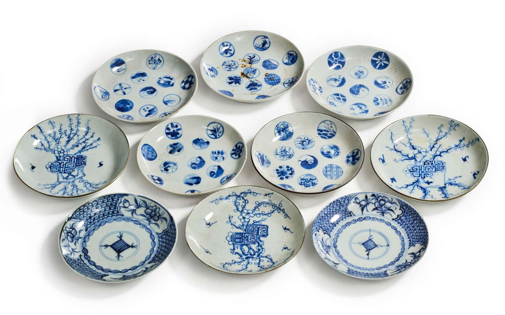 Lot de dix coupes circulaires en porcelaine bleu-blanc, cinq à décor de médaillons, trois à décor d'inscriptions auspicieuses accolées dans des prunus, deux à décor géométrique et de pivoines dans des médaillons sur fond de motif floral tapissant, quatre des bords cerclés de métal.