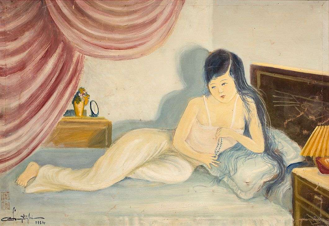 Jeune femme alanguie, 1934 Huile sur toile, signée et datée en bas à gauche 43 x 62 cm - 16 7/8 x 24 3/8 in. Oil on canvas, signed and dated lower left Accidents