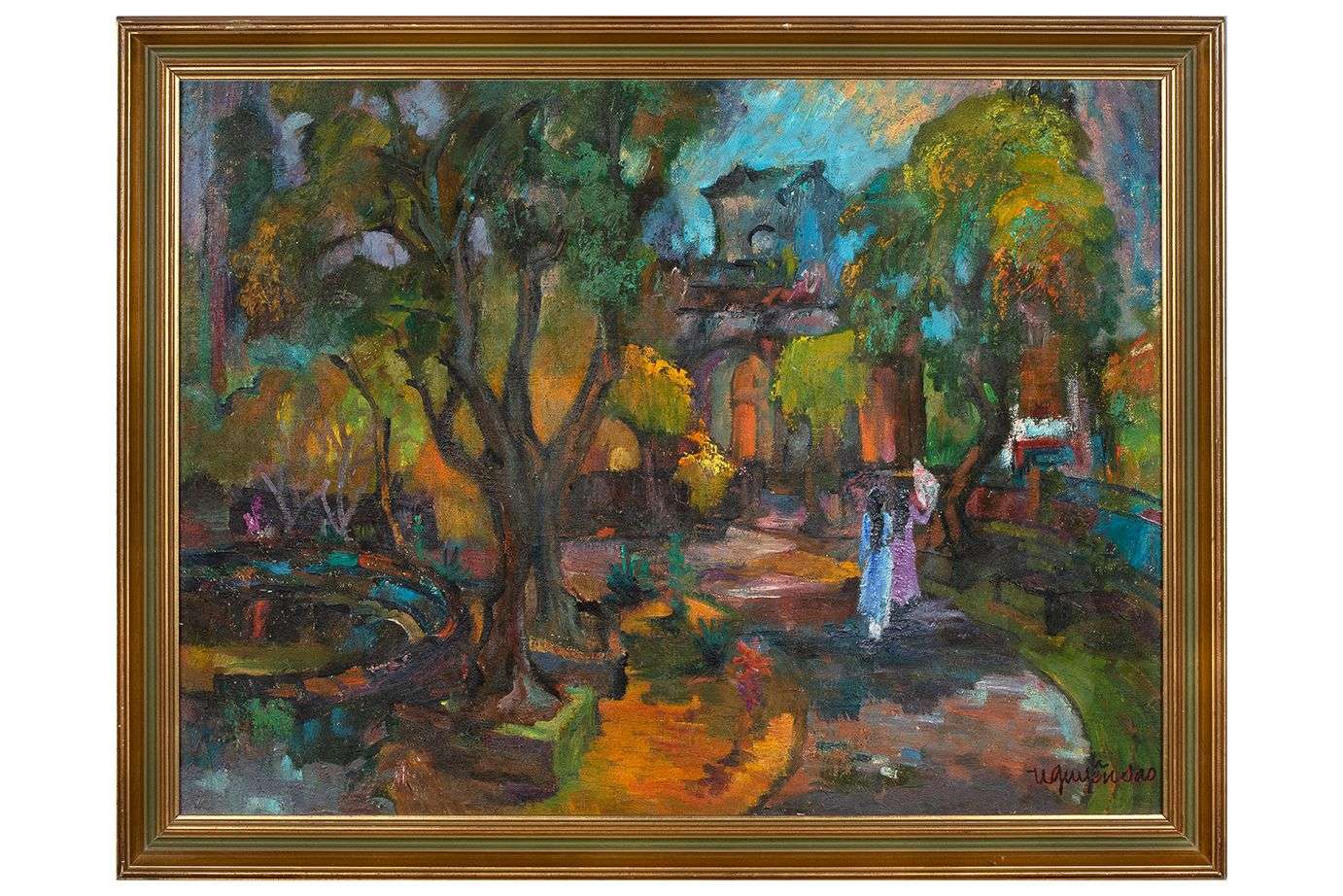 Personnages au temple de la littérature à Hanoï Huile sur toile, signée en bas à droite 46.2 x 61.3 cm - 18 1/8 x 24 1/8 in. Oil on canvas, signed lower right Provenance Collection privée, Région Lyonnaise Bon état général. Toile d'origine. General good condition, original canvas.