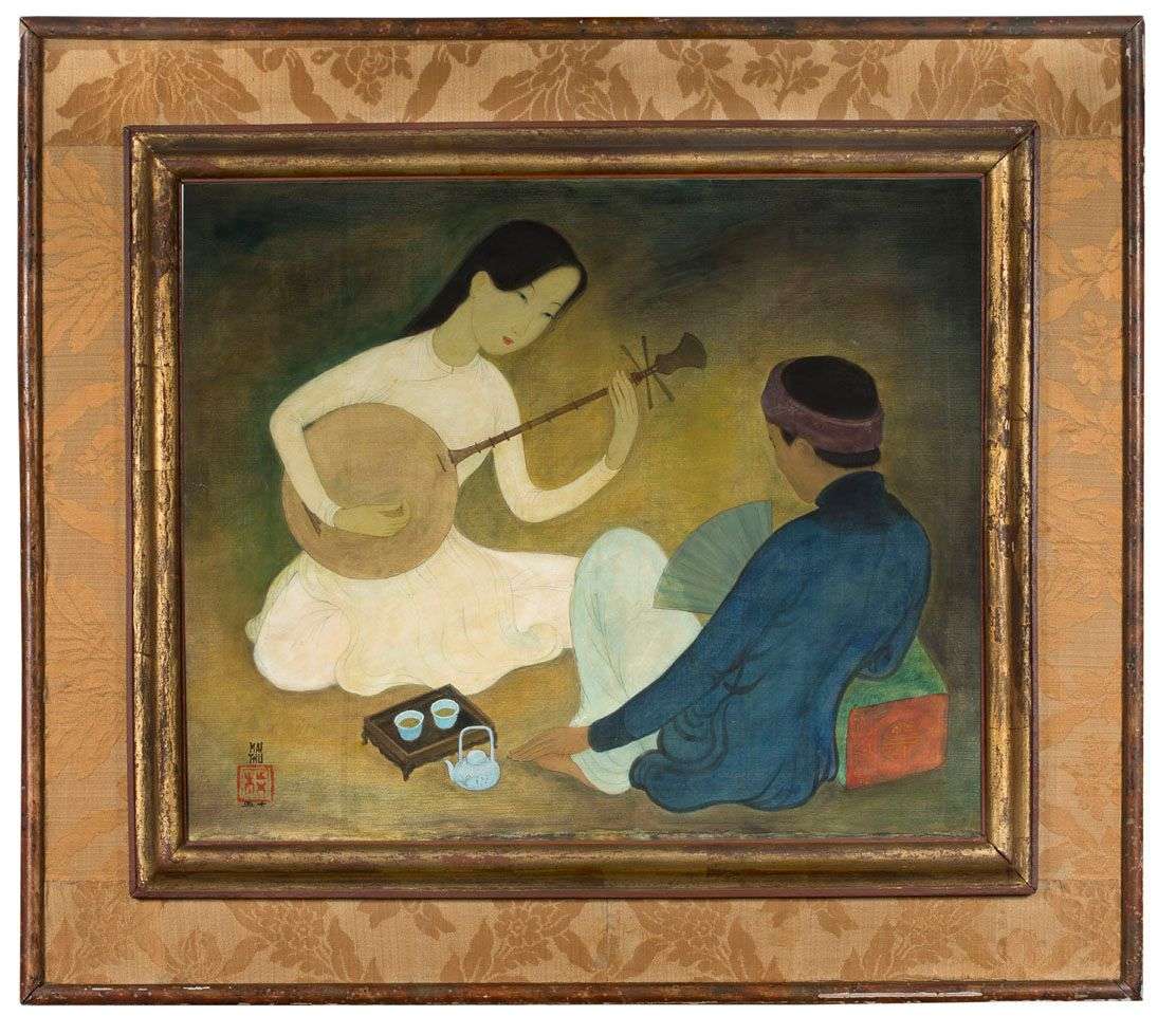 Les tonalités habilement choisies, se font discrètement écho et forment une joyeuse composition. Si la lecture de cette œuvre repose sur la culture natale de l’artiste, il parvient également à y insuffler de multiples références occidentales. En effet, fort de son apprentissage à l’École des Beaux-Arts de l’Indochine, mais aussi imprégné des techniques européennes Mai Trung Thứ reprend le savoir-faire de son continent d’adoption. La délicatesse du tissu laisse percevoir par transparence, le vêtement du personnage. Moment de partage et de sérénité, le thé tient une place importante dans la culture asiatique, illustré ici par la présence du petit service de porcelaine et du bateau à thé. en bois. Structurée autour de la mélodie, l’œuvre ici peinte est la symbiose de la peinture occidentale avec les origines de Mai Trung Thứ, démontrant une nouvelle fois la virtuosité de l’artiste. Soucieux d’offrir une œuvre d’art dans sa globalité, Mai Trung Thứ attache une part importante à la réalisation de l’encadrement qu’il effectue souvent lui-même. Artisan et artiste, Mai Trung Thứ maîtrise pleinement les préceptes de son enseignement qu’il a su dépasser et mettre au service de ses convictions.