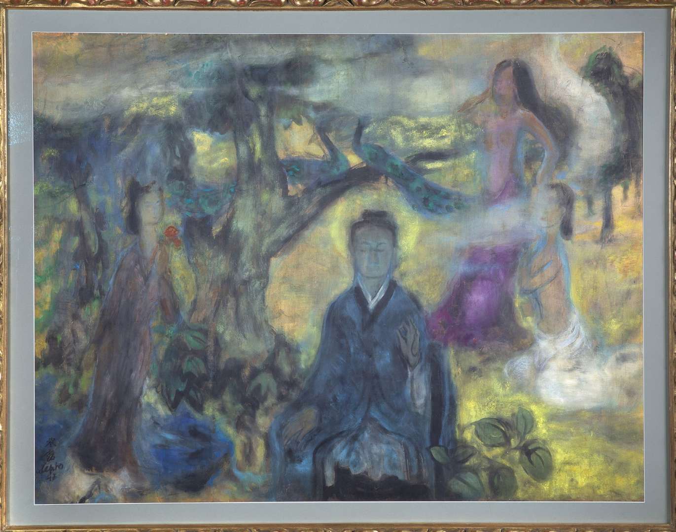 L’Illumination de Bouddha fait référence à l’Éveil de Siddhārtha Gautama. Après une vie d’opulence et de plaisirs, le prince s’astreint à la pauvreté et au jeûne. Ne trouvant la quiétude recherchée dans aucune de ces deux voies, il se rend au bord de la rivière, s’y baigne puis s’assied au pied d’un arbre pour entrer en méditation et ainsi trouver le chemin. Le démon Mâra cherche à l’empêcher d’atteindre l’Éveil et lui envoie plusieurs sortes de tentations : d’abord ses propres filles pour le séduire par la danse et la flatterie, ensuite ses soldats ou, selon les versions, ses montres. Siddhārtha Gautama reste impassible et devient alors Bouddha. « C’est près du village de Uruvelâ, au sud de Patna, que le Gautama, assis au pied d’un figuier, a la révélation de la connaissance révélatrice. »1 C’est la première tentation qui est représentée dans ce tableau de Lê Phô. Dans la culture bouddhique, l’armée de Mâra décrit les sentiments de confusion venant troubler l’esprit humain. Cette commande d’un particulier évoque le tourment intérieur sans aspect guerrier. Une femme fait une offrande à Gautama, les deux situées à droite du tableau paraissent danser et peuvent ainsi représenter les filles des démons Mâra. Quant aux deux paons posés sur une branche, ils peuvent être interprétés d’au moins deux manières. La première serait occidentale, issue de la mythologie grecque, et placerait l’animal comme symbole de vanité. La deuxième, plus proche de la culture bouddhiste, ces oiseaux comme symboles de beauté et de transmutation, chasseurs de serpents et synonymes d’immortalité. La nuée de fumée qui parcourt le tableau en halos illustre le lien entre la terre et le ciel, le matériel et le spirituel, l’âme vers l’au-delà. Cet épisode précède le sermon de Bénares lors duquel Bouddha partage ses révélations, et qui aboutit sur la conversion de cinq moines. Le nombre des adeptes augmente alors rapidement.