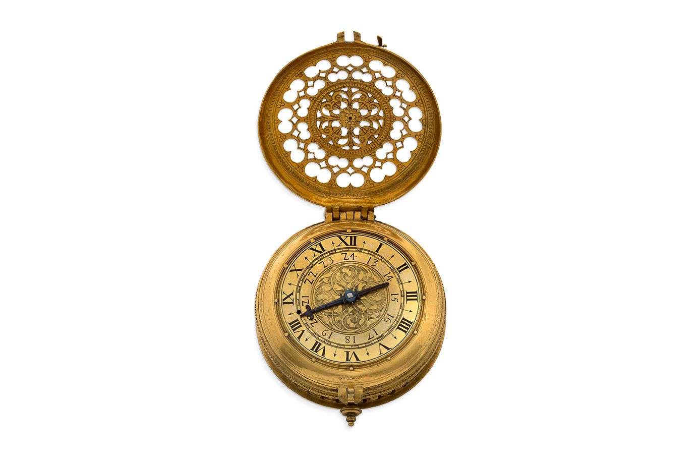 Boîtier redoré sur charnière avec couvercle de protection à arabesques ajourées et cran de sûreté, la carrure ajourée laissant apparaître la cloche, le dos également ajouré et finement ciselé de motifs de fleurs.