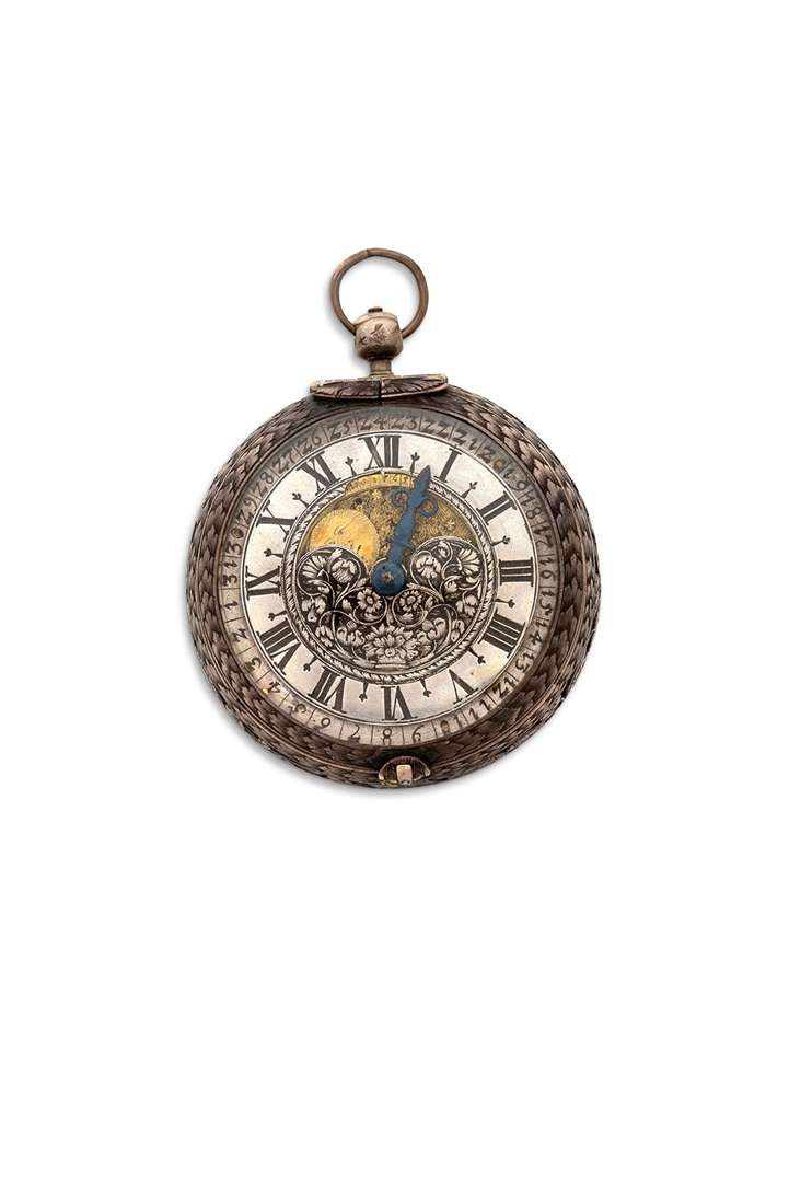 Cadran argenté avec une décoration ciselée au centre, ouverture pour les phases de la lune, chiffres romains, indication du quantième sur le pourtour.