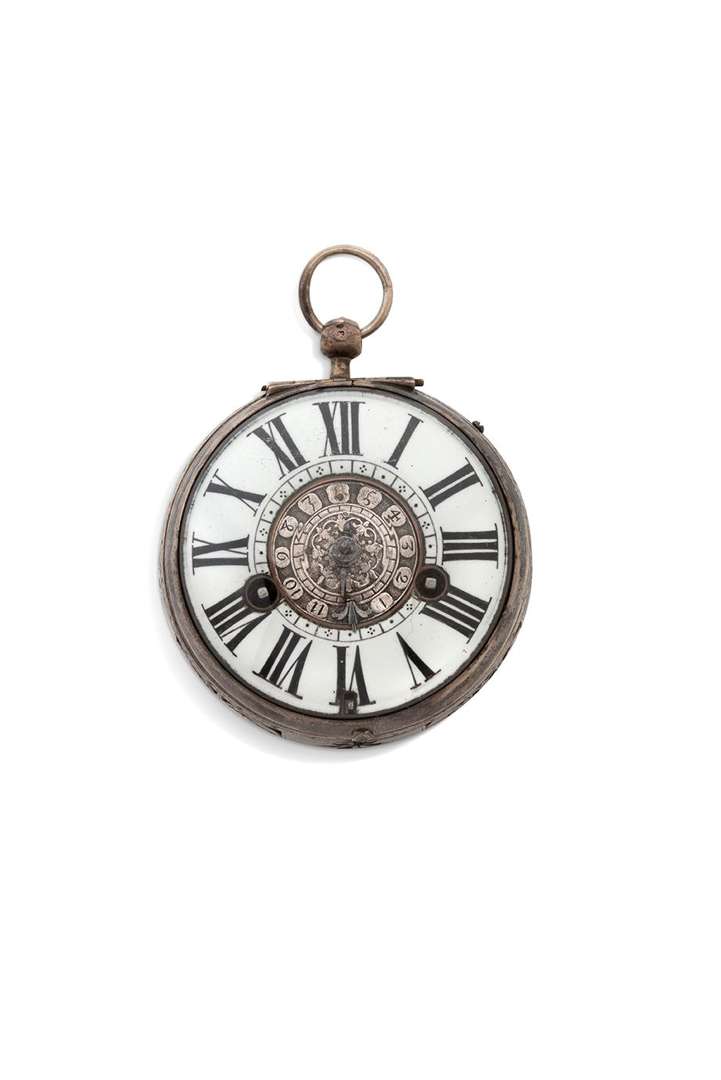 Cadran émail avec chiffres romains, deux ouvertures pour le remontage à clef, disque de réglage en argent au centre pour la mise à l'heure de la fonction réveil.