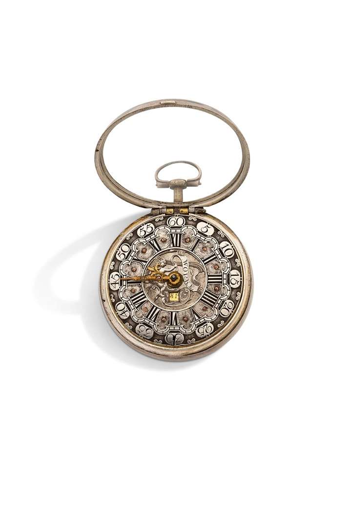 Mouvement mécanique avec remontage à clef, échappement à verge, coq ciselé et percé pour le marché continental à deux vis de fixation, balancier spiral, disque de réglage, signature sur la platine « In Worke London 11417 ».