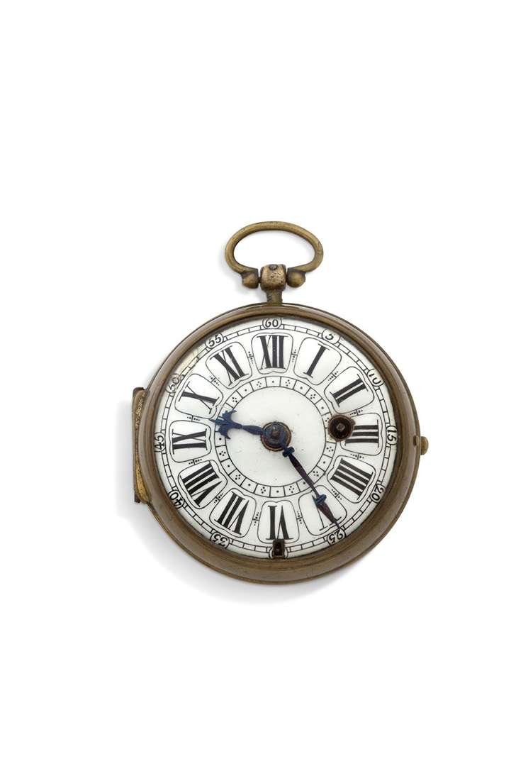 Cadran émail blanc avec heures en relief chiffres romains, indication des minutes en chiffres arabes, minuterie chemin de fer, ouverture pour le remontage à clef.