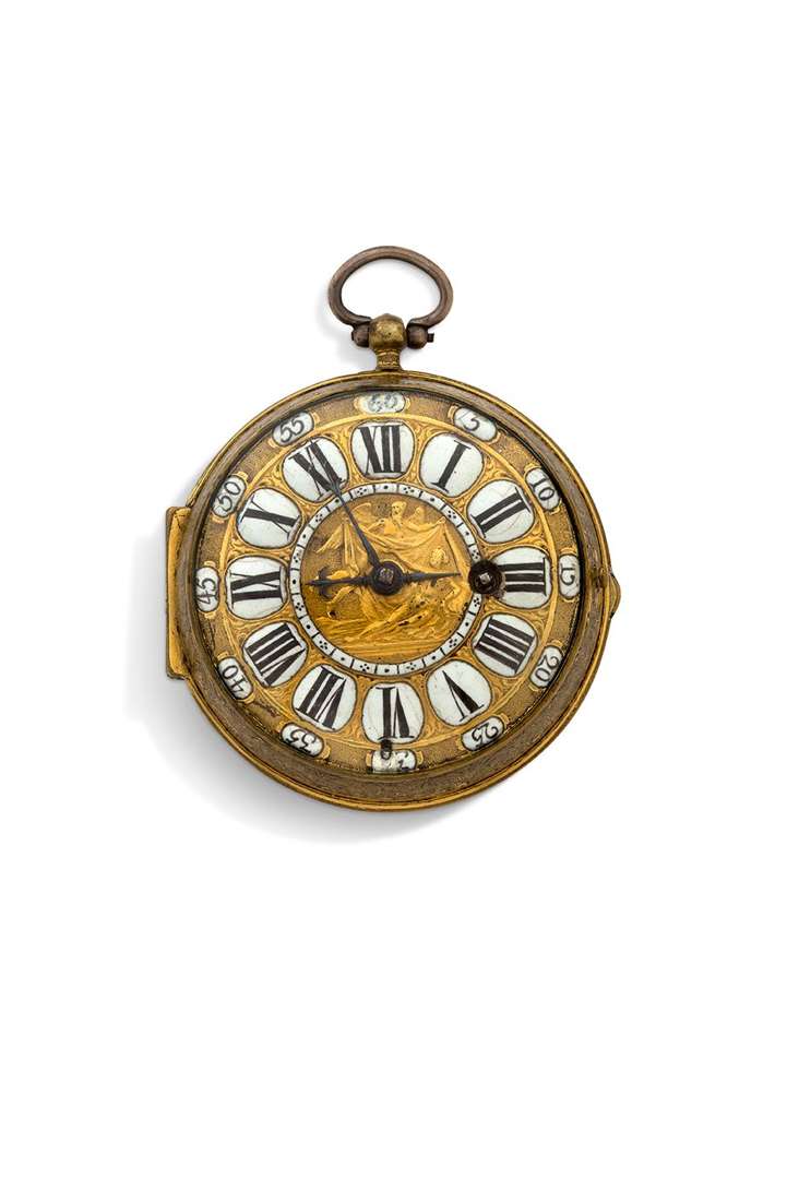 Montre oignon en métal doré avec coq en émail polychrome représentant « la charité romaine »