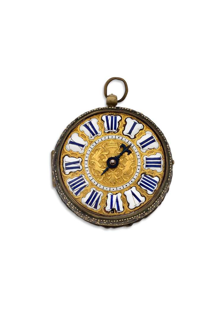 Cadran ciselé à une seule aiguille avec cartouches en émail chiffres romains, minuterie chemin de fer en émail dans un cercle, décoré de feuilles d'acanthe et une urne au centre.