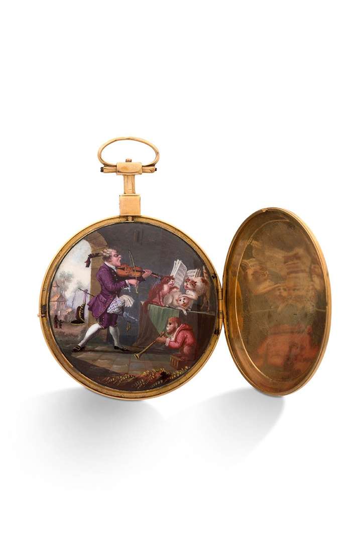 Boîtier sur charnière avec ouverture au pendant, dos lisse, le côté du pendant portant la marque « PP », une ouverture secrète au dos avec une peinture sur émail représentant le « concert du violoniste ».
