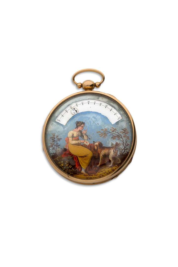 Cadran peint représentant une jeune femme habillée à l'antique, tenant une lettre dans sa main, un chien avec un panier dans sa gueule à ses pieds, disque tournant pour l'affichage des heures sur une graduation des minutes dans un guichet.