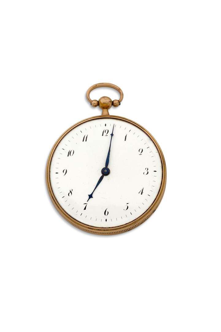 Boîtier sur charnière, carrure cannelée, cuvette en métal doré avec double fonction pour la sonnerie / silence ainsi que la petite et grande sonnerie, poinçon de maître à l'intérieur « DG ».
