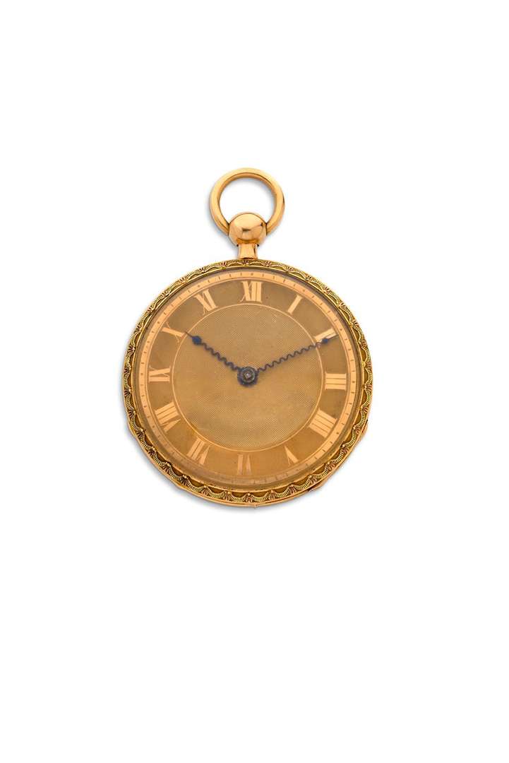 Boîtier sur charnière avec carrure guillochée, le dos avec une décoration en relief à motif de fleurs, feuillages et grappes de raisins, cuvette en métal doré, l'intérieur numéroté « 1879 », déclenchement de la sonnerie par le pendant.