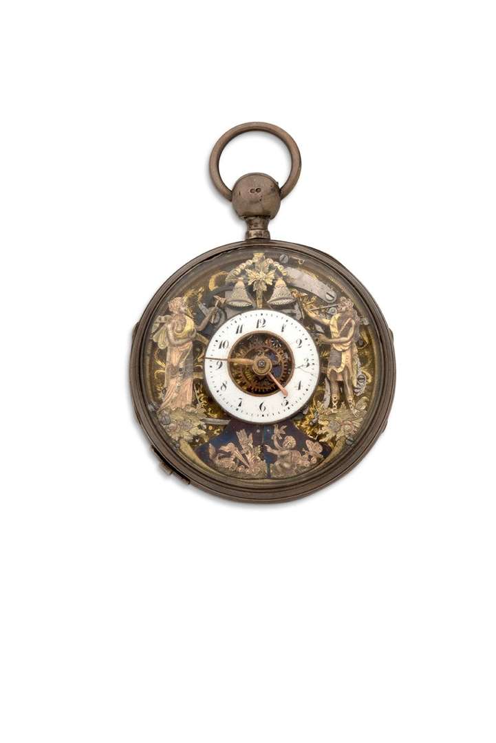 Montre en argent avec répétition des quarts et automates Jacquemarts, ouverture secrète pour la scène érotique