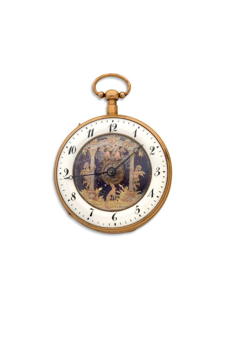 Montre en or et émail bleu translucide avec répétition des quarts sur deux automates