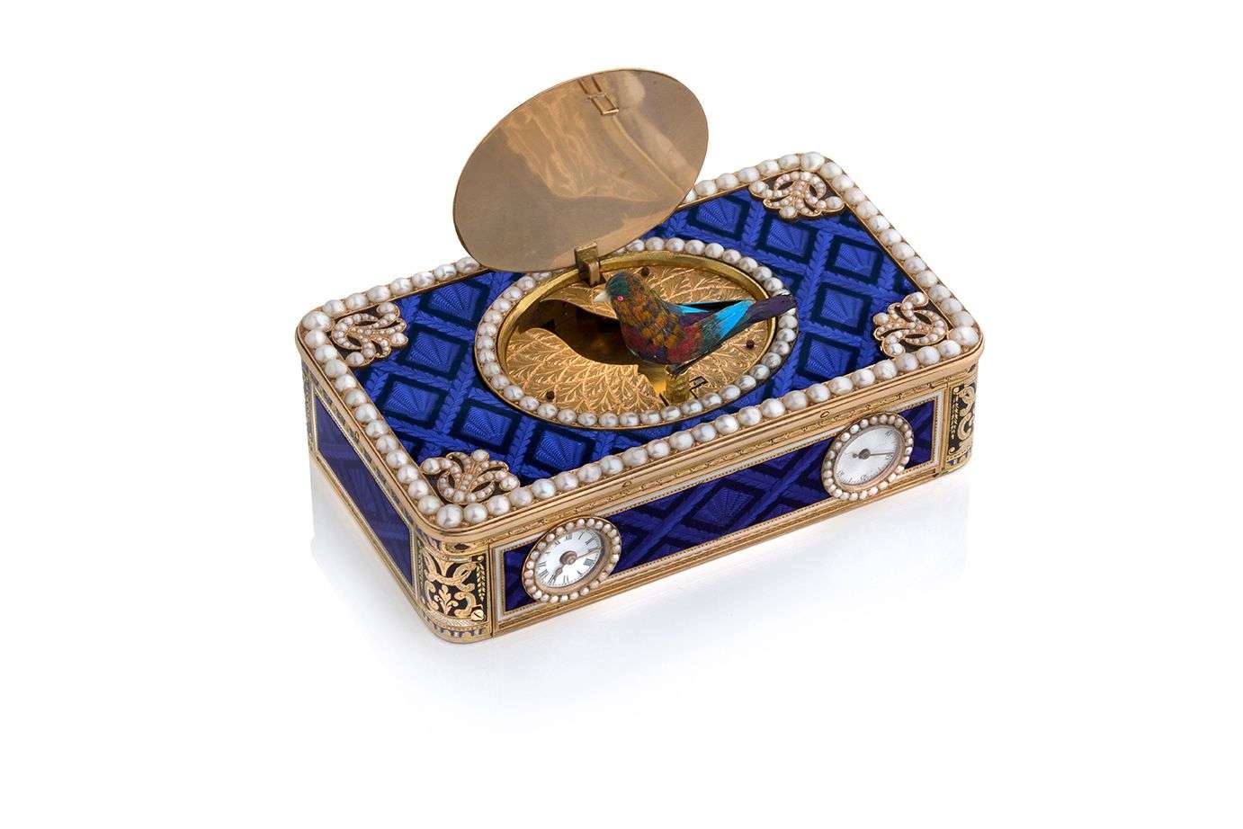 Boîtier de forme rectangulaire arrondie, émaillé bleu translucide sur guillochage treillis, deux cadrans en façade, l'un pour les heures et minutes, l'autre pour les secondes, l'ensemble est décoré de demi-perles, le couvercle ovale sur charnière peint sur émail protège l'oiseau chanteur à automate.