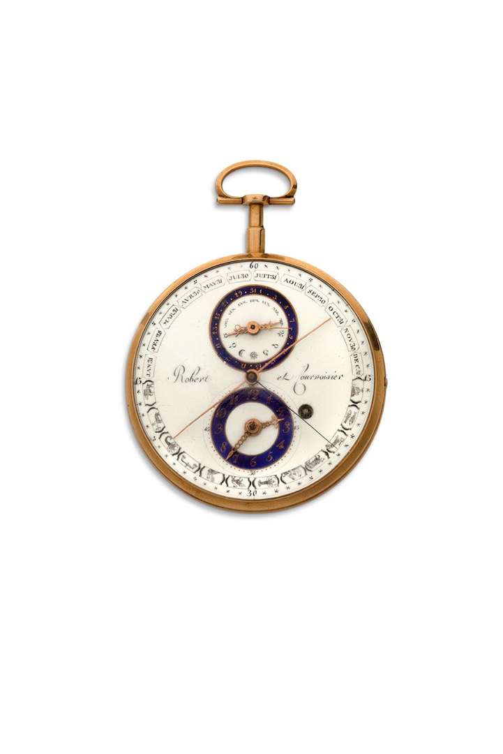 Cadran émail blanc et bleu avec indication des heures et minutes excentrées, secondes au centre, cadran auxiliaire à 12h pour indiquer les signes astrologiques des planètes et le quantième, sur le pourtour les mois et les signes du zodiac, signé « Robert et Courvoisier ».