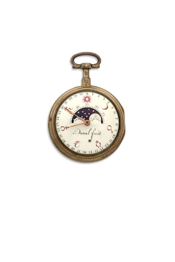 Sur une montre marquant les 12 mois de l'année, l'équation de 10 en 10 jours, secondes au centre, au dos les quantièmes, les phases de la lune : A Rouen 1773 ».