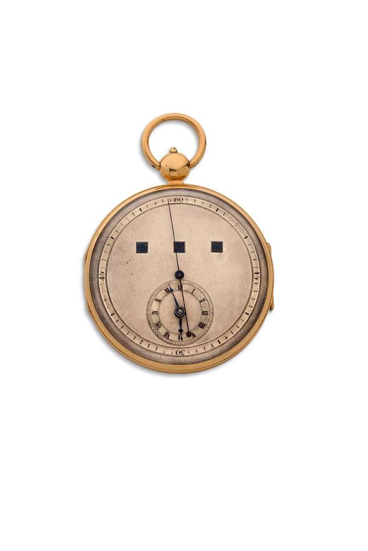 Montre de poche en or avec cadran régulateur, secondes au centre et ouvertures à guichet pour les dés à jouer