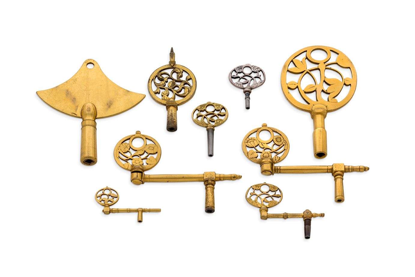 Composé d'un boîtier de protection de montres en cuir clouté, d'un petit pilulier transformé à partir d'un boîtier miniature et d'une collection de clefs de montres anciennes, stylisées de différentes tailles, la plupart pour des montres à remontage à clef.