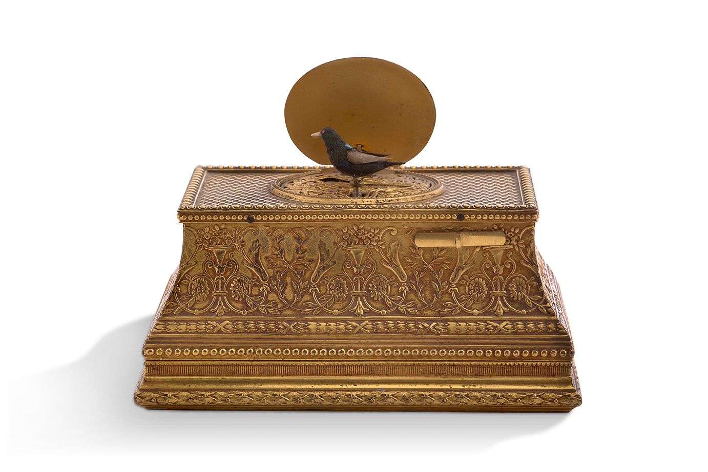Boîtier rectangulaire, l'ensemble décoré de volutes et décors feuillages, bouquets de fleurs sur la tranche, le couvercle de l'oiseau chanteur reprenant les motifs de l'amour avec un carquois et une torche flamme.