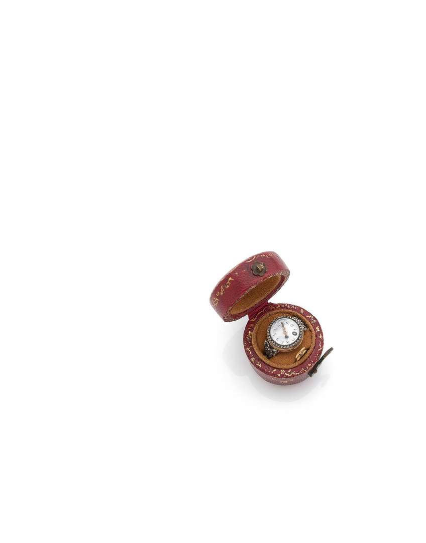 Montre bague en or et diamants dans un écrin en maroquin rouge avec une clef de remontage