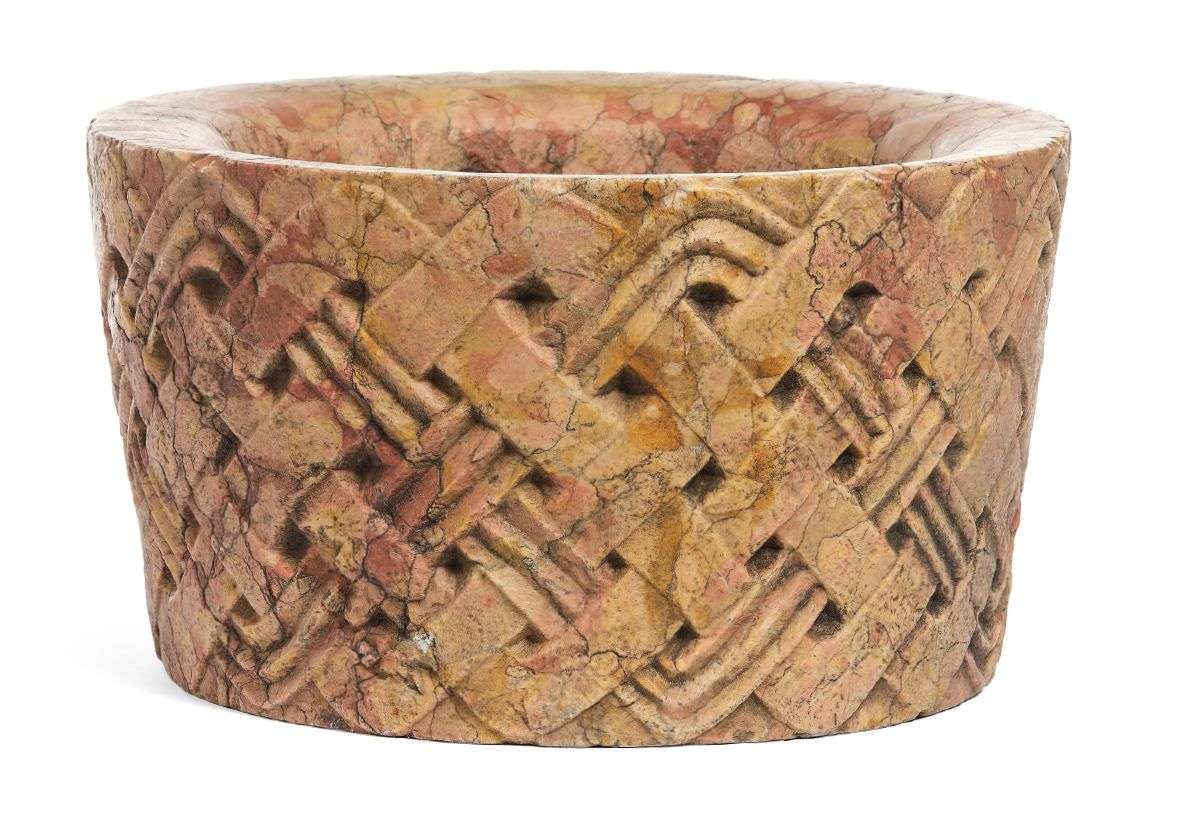 CUVE CIRCULAIRE en marbre de Vérone sculpté, le pourtour à décor fretté de bandes lisses et rainurées en trois.