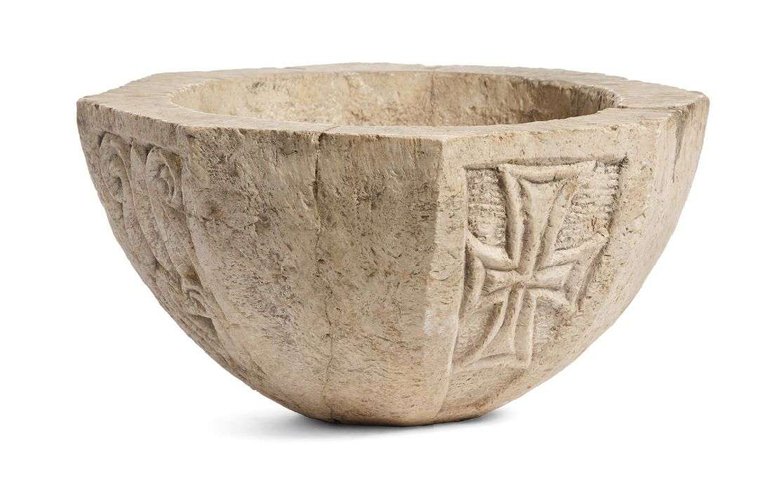 PETITE CUVE BAPTISMALE octogonale en pierre marbrière blanche sculptée, quatre pans sculptés de bas reliefs en rinceaux et un pan à la croix.