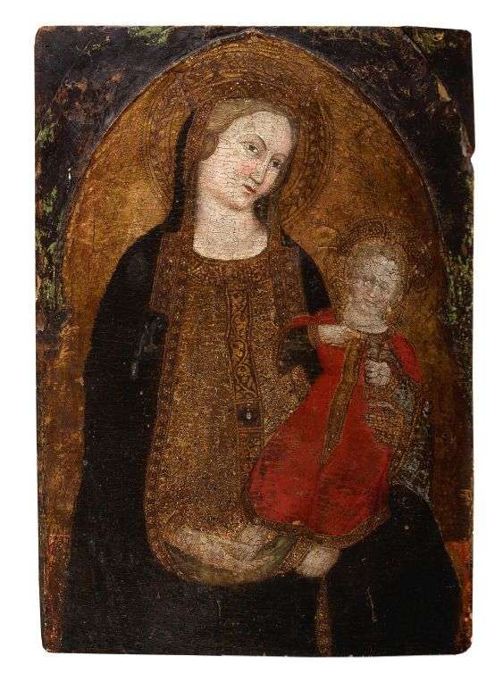 VIERGE À L'ENFANT Tempera sur panneau de bois à fond doré incisé où la Sainte Vierge, assise, trône en majesté, couronnée et nimbée, présentant son Enfant Jésus vêtu de rouge et tenant de sa main gauche un oiseau.