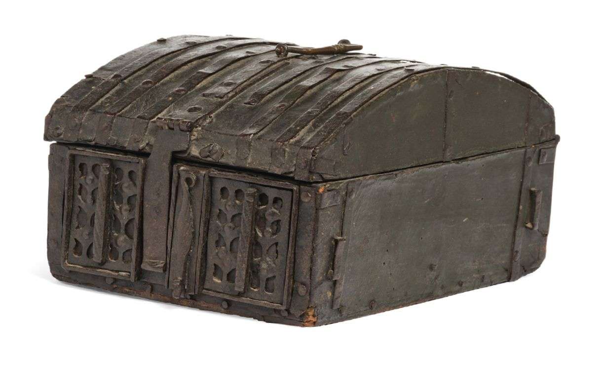 COFFRET DIT « DE MESSAGER » en fer forgé et cuir teinté vert foncé sur une âme de bois. Le couvercle bombé.