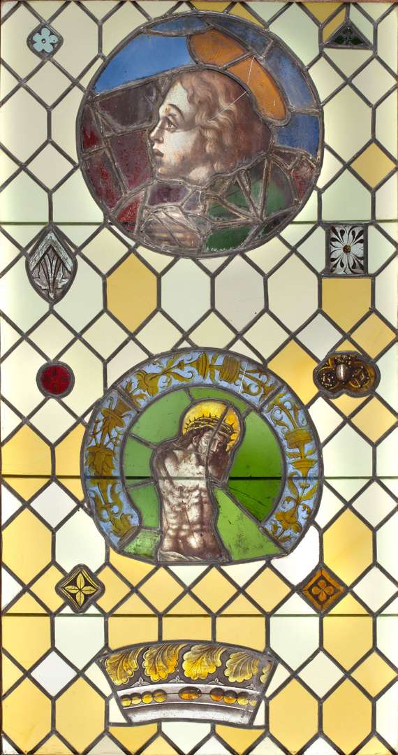 VITRAIL composé de fragments en grisaille et polychromes : profil de saint Jean (?), Christ en croix entouré d'une frise de candélabres, motifs floraux, couronne.