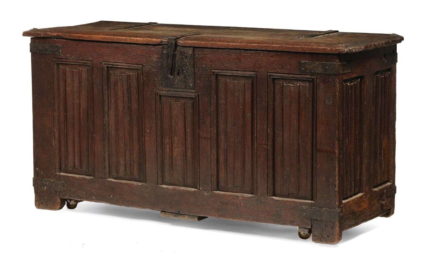 COFFRE en chêne sculpté façade et sur les côté latéraux de neuf panneaux à décor en plis de serviette. Plateau supérieur abattant se refermant par un moraillon en fer forgé.