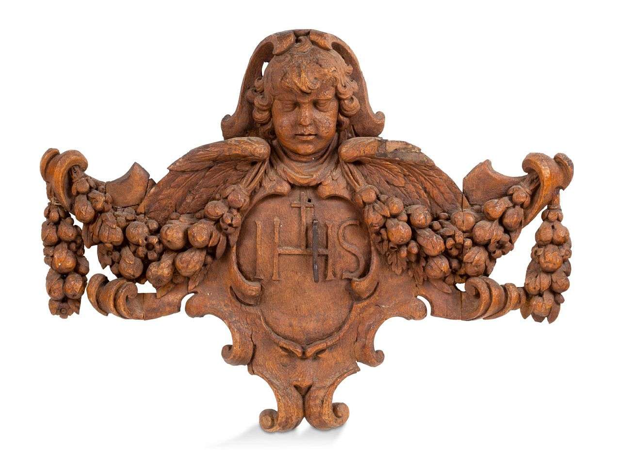 PANNEAU DE VEILLEUSE EUCHARISTIQUE en peuplier sculpté représentant un cartouche de cuir découpé surmonté d'une tête d'angelot avec le monogramme du Christ et des guirlandes de fruits.