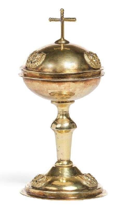 CIBOIRE en argent doré (vermeil), le couvercle sommé d'une croix et décor appliqué de trois couples d'anges. Pied balustre et piédouche à décor appliqué de trois couples d'angelots. Traces de poinçons illisibles.