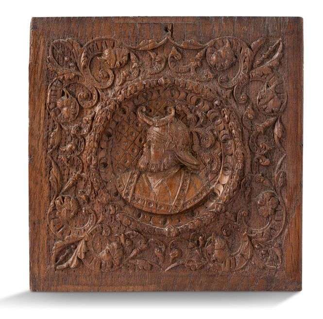 PAIRE DE PANNEAUX en chêne sculpté à décor, dans des médaillons à fonds quadrillés, d'un profil d'homme casqué pour l'un et d'un jeune homme à mi-corps tenant des fleurs dans la main pour l'autre, dans un entourage de guirlandes feuillagées.